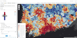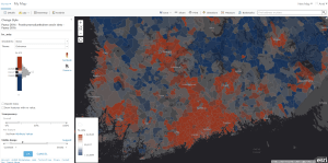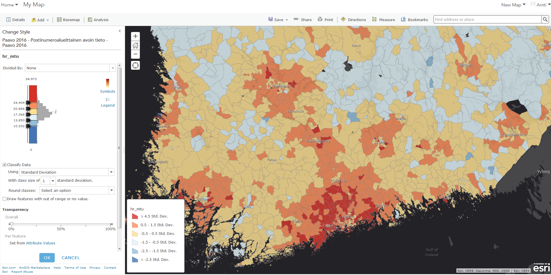 Visualisointityökalu avautuu, ja ykköskohdassa valitaan pudotusvalikosta hr_mtu, jotta saadaan väriteltyä karttaa nimenomaan mediaanitulojen mukaan. Smart Mapping aktivoituu ja vaihtaa värisävyt automaattisesti.